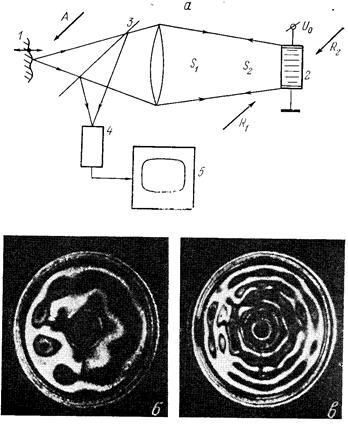Рис. 2.4 Схемабезперервноговідновленняголографічноїінтерферограммизусередненнямвчасізвикористаннямзустрічнонаправленогозчитуючогопучка R2 [13, 14] (а) іголографічнаінтерферограммадифузора, щоколиваєтьсянарізнихчастотах (б, в).