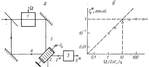 Рис. 3.1 Адаптивний інтерферометр на основі ФРК (a) і його передавальна характеристика (тобто залежність амплітуди вихідного сигналу IR Ω від частоти модуляції F=Ω/2π (б). а: 1 — елемент, в якому здійснюється фазова модуляція снгнального пучка; 2 — зразок ФРК; 3 — фотодетектор, що перетворює модуляцію інтенсивності світлового пучка в електричний сигнал UΩ .