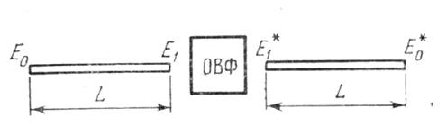 Припустимо, що на вхід волоконного світловода подається зображення, яке переноситься когерентним монохроматичним променем з розподілом електричного поля в поперечному перерізі E0 (r). Це поле збуджує деяку кількість мод з різними поперечними індексами. В процесі поширення це зображення спотворюється через відмінності фазових швидкостей різних поперечних мод. Якщо випромінювання після проходження довільної довжини L обернути, то після зворотного проходу по світловоду отримаємо початкове зображення в результаті ефекту самокомпенсації. Точніше кажучи, отримаємо відновлене поле E2 (r)~E0 (r), яке дає те ж зображення, тобто картину інтенсивності I2 (r)~|E0 (r)|2 , що і у початкового поля. Дійсно, світловод без втрат можна розглядати в якості спотворюючого елементу. Більш того, якщо світловод ідеально однорідний (однаковий) по всій довжині, то зворотній прохід по тому ж світловоду можна замінити на еквівалентний йому прохід по другому світловоду тієї самої довжини L (рис.4.2).
