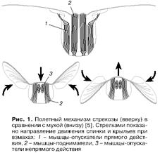 Крылья насекомых в отличие от крыльев летающих позвоночных животных лишены собственной мускулатуры и приводятся в движение сокращениями мышц груди. (рис.1). Морфункциональную связь между мышцами и крыльями осуществляют скелет птероторакса и крыловые сочленения. Усилие от сокращения мышц передается сперва на спинную область сегмента – тергум, а затем на основание крыльев. Крыло насекомого представляет собой рычаг первого рода и для того, чтобы поднять или опустить его, совсем необязательно прикладывать усилие к длинному плечу – пластине крыла. Достаточно на небольшой угол опустить или поднять короткое плечо, надавив на него краем спинки (рис. 1). Последняя уплощается или выгибается под действием мышц, называемых мышцами непрямого действия.От этой схемы резко отличается работа летательного аппарата у стрекоз. У них крыловые мышцы прикрепляются непосредственно к основаниям крыльев (рис. 1). Такие мышцы, называемые крыловыми мышцами прямого действия, при сокращении тянут крылья за основания вниз, опуская их на некоторый угол. У всех прочих насекомых мускулы – опускатели относятся к крыловым мышцам непрямого действия, так как прикрепляются не к основаниям крыльев, а к двум складкам спинки спереди и сзади от крыла. Когда такие мышцы сокращаются, спинка аркообразно выгибается, приподнимая основания крыльев, вследствии чего их лопасти опускаются. Мускулы – подниматели опускают спинку, а с ней и основания крыльев, что приводит к движению крыльев вверх. У стрекоз мускулы – подниматели опускают спинку, а с ней и основания крыльев, что приводит к движению крыльев вверх. У стрекоз мускулы – подниматели прикрепляются близко друг к другу на спинке, а сама спинка маленькая и не играет большой роли в движении крыльев, однако крыловые мышцы прямого действия развиты у них сильнее, чем у других насекомых. Такая система движения крыльев неспособна обеспечить их быстрые взмахи, но обладает тем преимуществом, что каждое из четырех крыльев работает независимо. Это позволяет стрекозам совершать в воздухе различные сложные маневры. Все прочие насекомые (мухи, перепончатокрылые, клопы) мало уступают стрекозам в маневренности, которая достигается взмахами крыльев правой и левой сторон с подчас очень высокой частотой. Кроме того, большинство насекомых обладают способностью изменять наклон плоскости взмаха по отношению к продольной оси тела.