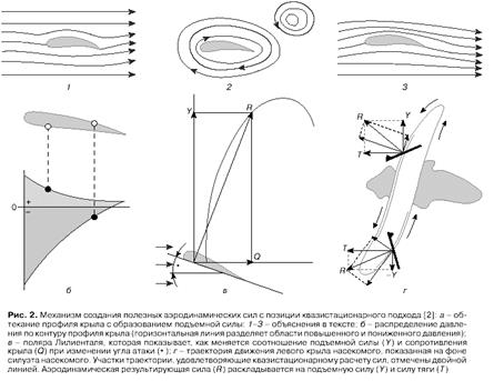 В соответствии с этим подходом обтекание крыла, совершающего взмахи, рассматривается как последовательность отдельных стационарных ситуаций, когда изменениями угла атаки и скорости набегающего потока можно пренебречь. Моментов, удовлетворяющих квазистационарному подходу, в цикле взмаха два: один из моментов приходится на большую часть нисходящей ветви траектории, другой на нижнюю треть восходящей (рис. 2, г). При движении вниз крыло создает подъемную силу и тягу, при махе вверх – тягу и отрицательную подъемную силу. Создает ли крыло какие – либо силы в другие фазы взмаха, неизвестно, так как процессы, происходящие в верхней и нижней точках траектории, не поддаются описанию с позиции квазистационарного подхода.