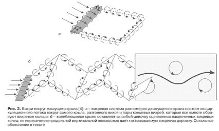 Если теперь представить, что крыло совершает колебания в плоскости, перпендикулярной к набегающему потоку, то поочередно отделяющиеся от крыла разгонные и тормозные вихри образуют цепочку сцепленных друг с другом вихревых колец (рис. 3, б). Кольцо, образовавшееся при махе вниз, будет обладать импульсом, направленным вниз и назад, и в то же время крыло из-за перепада давления на его верхней и нижней поверхностях разовьет подъемную силу и тягу и отрицательную подъемную силу, а кольцо, образовавшееся в это время, будет обладать импульсом, направленным вверх и назад. Следовательно, в возмущениях, которые производят в воздухе машущие крылья, или, иначе в аэродинамическом следе, который они оставляют, как бы в зашифрованной форме содержится информация о характере взаимодействия крыльев с воздушными потоками. Структура следа – своего рода ключ к пониманию природы сил, создаваемых машущими крыльями.