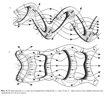 Работа крыла реального насекомого отличается от рассмотренной схемы тем, что только вершина крыла совершает колебания относительно неподвижного основания. Кроме того, само крыло в верхней и нижней точках взмаха испытывает вращательные колебания относительно своей длинной оси. Тем не менее, когда удалось наконец визуализировать след (то есть сделать его видимым) летящего насекомого [2], то оказалось, что его форма почти идентична форме следа, который образуется за крылом, совершающим колебания в плоскости, перпендикулярной к набегающему потоку (рис. 3, б) впервые трехмерную картину аэродинамического следа за летящим насекомым средних размеров с относительно невысокой частотой крыловых взмахов (30 Гц) – для бабочки – толстоголовки (рис. 4). Какова же она? Прежде всего, след представляет собой систему попеременно наклоненных к оси вихревых колец. Через отверстия колец проходит толстая волнообразно изгибающаяся струя воздуха. Если вертикальной продольной плоскостью рассечь такой след, то получим его плоское изображение (рис. 3,б), так называемую вихревую дорожку – вокруг центральной струи в шахматном порядке располагаются вихри, вращающиеся навстречу друг другу. Изменение параметров взмаха крыльев, таких как амплитуда колебания, частота, наклон плоскости взмаха к продольной оси насекомого и направлению полета, сопровождается закономерным изменением формы аэродинамического следа [4].