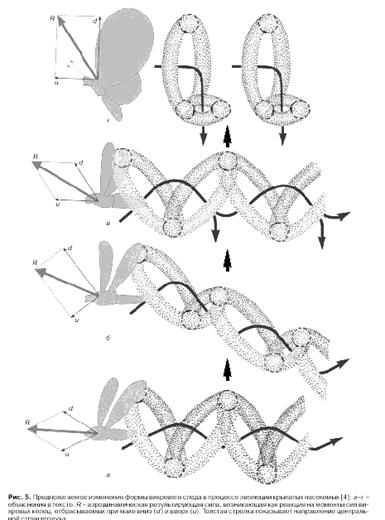 У некоторых насекомых в полете за крыльями образуется вихревой след, форма которого аналогична той, которая характерна для наиболее примитивных насекомых (рис. 5 , в). Есть, однако, существенное отличие. Исследования показали, что кольцо малого диаметра, образовавшееся при махе вниз, во время подъема крыльев расширяется. Как и в предыдущем случае (рис. 5, б), в данном случае мах вниз активнее, чем вверх, но из-за того, что кольцо малого диаметра при подъеме крыльев расширяется, след принимает вид прямой вихревой дорожки. Расширяющееся кольцо придает ускорение струе воздуха, направленной косо вниз, что, по предположению компенсирует отрицательную подъемную силу, создаваемую при махе вверх. В итоге распределение сил в цикле взмаха выглядит следующим образом: подъемная сила создается при махе вниз, а тяга – в течение всего цикла взмаха. Следовательно, генерацию сил при махе вверх можно объяснить с позиций нестационарного действия крыла. Более того, при развороте крыльев в верхней точке взмаха они отталкивают ближайшее к телу кольцо, а вместе с ним и всю цепочку назад, в результате чего насекомое получает небольшой толчок вперед. Следовательно, образование сил в верхней точке взмаха можно объяснить действием механизма, близкого к реактивному.