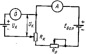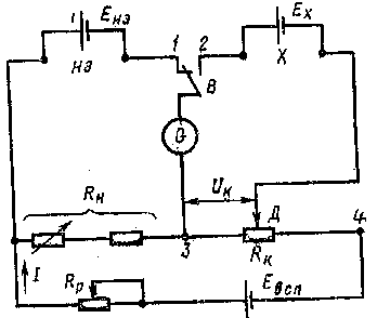 После установления рабочего тока I для измерения Ех переключатель В ставят в положение 2 и регулировкой образцового компенсирующего сопротивления Rк вновь доводят до нуля ток в цепи гальванометра G. Тогда