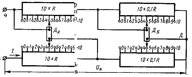 Сопротивление RK выполняют по специальным схемам, которые обеспечивают постоянное сопротивление между точками 3, 4 и переменное сопротивление между точками 3, Д, а также необходимое число знаков и точность отсчета.