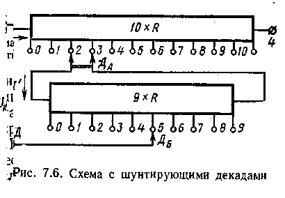 общее сопротивление между точками 3 и 4 (см. рис. 7.4) остается неизменным. Ток через ceкции сопротивлений нижней декады Г в десять раз меньше тока ' через секции сопротивлений верхней декады, т. е.