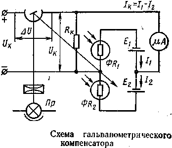 Согласно схеме включения фоторезисторов и полярности Uх сопротивление фоторезистора ФR1 уменьшится, а ФR2 увеличится. Через резистор RK потечет ток Iк, создавая на RK компенсирующее напряжение UK, почти равное измеряемому напряжению Ux. Значение тока Iк автоматически изменяется в зависимости от изменения измеряемого напряжения Ux, но всегда так, что выполняется условие Ux ~ UK обеспечиваемое за счет небольших изменений тока Iг в цепи гальванометра: