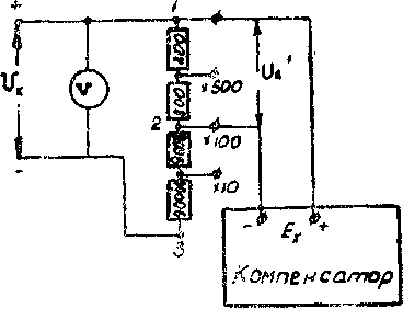 Измеряемое напряжение Ux подводится к зажимам I—3, делителя напряжения (рис. VI-26). Поскольку величина Ux может меняться в больших пределах, достигая сотен и даже тысяч вольт, а компенсатор непосредственно способен измерять напряжение порядка (1ч2) в, между компенсатором и измеряемым напряжением включают делитель напряжения.