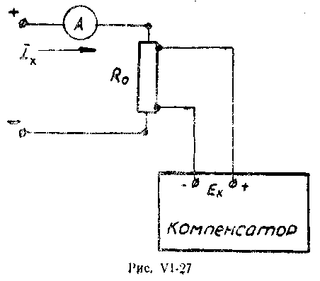 Измеряемый ток, который проходит по поверяемому амперметру (в случае его поверки), пропускается через образцовое сопротивление Ко, значение которого известно с достаточной степенью точности (рис. VI-27).
