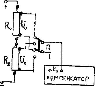 Измеряемое сопротивление Rx включается чаще всего последовательно с образцовым сопротивлением R0. Падения напряжений, создаваемые на этих сопротивлениях, Uх и UQ, измеряются компенсатором (рис. VI-28).