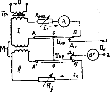 Компенсатор состоит из двух контуров: / и //. Напряжение источника питания схемы U, связанное с первым контуром через трансформатор, вызывает в этом контуре ток I1, величину которого можно регулировать реостатом Rрег и измерять амперметром.