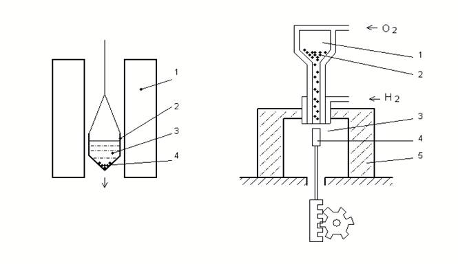 Второй способ: Тончайший порошок окиси алюминия из зёрен размером 2-100 мкм высыпается тонкой струёй из бункера, проходит через кислородно-водородное пламя, плавится и в виде капель попадает на стержень из тугоплавкого материала. Температура стержня поддерживается несколько ниже температуры (2030). Капли окиси алюминия охлаждаются на нём и образуют корку спекшейся массы корунда. Часовой механизм медленно (10-20мм/ч) опускает стержень, и на нём постепенно вырастает неогранённый кристалл корунда (рис 2).
