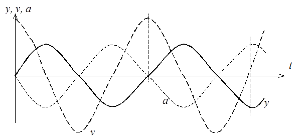 Знак " – " означает, что ускорение направлено в сторону, противоположную смещению. Изменение y, v, a с течением времени можно представить так: