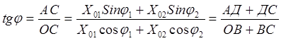 Представим оба колебания в виде векторов амплитуды Х01 и Х02 , Сложение векторов выполним графически.