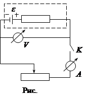 разомкнут. В этом случае электрический ток идёт только через вольтметр и источник тока. Допустим далее, что вольтметр имеет достаточно большое омическое сопротивление. Тогда током, протекающем в цепи, можно в первом приближении пренебречь. Поскольку мы пренебрегаем током в цепи, постольку отсутствует падение напряжения на внутреннем сопротивлении r
