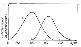 Рис. 1.1. Спектр поглощения (1) и флуоресценции (2) типичного лазерного красителя