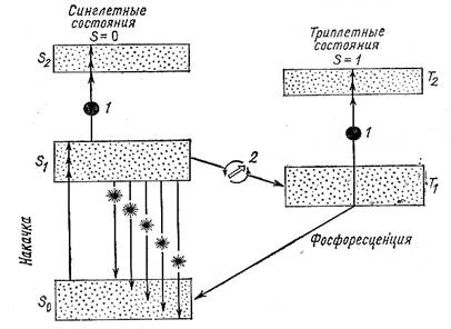 Синглет-триплетные переходы S1 ÞT1 (интекомбинационные перходы 2) приводят к сильному поглощению лазерного излучения и срыву генерации за счет перехода T1 ÞT2 , ограничивающих выходную мощность (перходы 1).