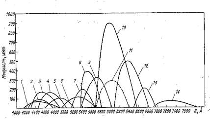 ); 8 — Na-флуоресцеии (4 Вт суммарного излучения); 9— родамин 110 (4 Вт суммарного излучения); 10— родамин 6G (4 Вт суммарного излучения); 11— родамин 6G (2 Вт суммарного излучения); 12— родамин В (4 Вт суммарного излучения); 13—перхлорат крезила фиолетового (5 Вт суммарного излучения; 14—перхлорат нильского голубого (0,75 Вт, 6471