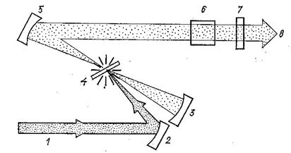 Резонатор образован отражателем 3 (с радиусом кривизны r=5 см и коэффициентом отражения R=100%) и плоским выходным зеркалом 7 (R=95-98%). Вспомогательное зеркало 5 (r - 7,5 см, R=100%) служит для уменьшения габаритов резонатора и обеспечивает параллельность лазерного излучения 8 на выходе и излучения накачки 1, направляемого в объем поворотным зеркалом 2. Поток красителя 4 направлен перпендикулярно к плоскости рисунка и расположен под углом Брюстера к излучению накачки. Длины волн перестраиваются селектирующим элементом 6.