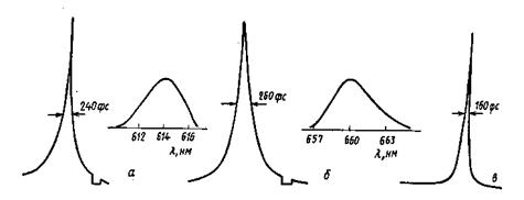 Генерирующим красителем для «мягкого» НП ДОДКИ был выбран Р6Ж. Оптимальная концентрация составляла 4•10-3 моль/л. В режиме самонастройки (т. е. без селектора) при концентрации НП 2*10-5 моль/л происходила одновременная генерация на двух длинах волн: l1 =614 нм и l2 =570 нм. При этом на l1 генерировались импульсы длительностью Dt»0,5 пс, а на l2 синхронизация отсутствовала. При увеличении концентрации НП генерация на l1 подавлялась. Стабильный режим генерации УКИ на l1 достигался применением специального выходного зеркала с резким увеличением пропускания для длин волн менее 600 нм и пропусканием около 3 % на 614 нм. С таким выходным зеркалом лазер генерировал на l1 =614 нм, т. е. в области, где ДОДКИ хорошо насыщается. Дальнейшее увеличение концентрации НП укорачивало импульс, но уменьшало среднюю мощность НЛК. Импульсы длительностью 120 фс были получены при концентрации ДОДКИ 6*10-5 моль/л. При этом выходная мощность НЛК составила 10 мВт. Зона допустимого рассогласования длины резонатора НЛК и частоты следования импульсов накачки составляла 20 мкм. На рисунке, а приведены АКФ такого режима генерации и спектральная огибающая импульсов (ширина огибающей на полувысоте Dl=3,6 нм). Соотношение DtDn=0,35 свидетельствует о спектральной ограниченности импульсов. Однако отношение полуширины АКФ на 1/4 и 1/2 высоты, равное 2,5, говорит о существенном отклонении формы импульса от гауссовой или лорентцевой.