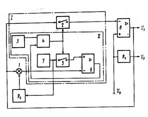 Функциональный блок (рис. 3.2 ) состоит из сумматора аналоговых сигналов 1, аналогового умножителя I и инвертора. Аналоговый умножитель двухквадрантного типа выполнен по схеме с широтно-импульсным преобразователем. Он включает в себя: ключи 2 и 5, генератор треугольного напряжения 3, компаратор 4, усилитель 6 и источник опорного напряжения 7. Цепь 6—5—7 обеспечивает стабилизацию широтно-импульсного модулятора II, выполненного на элементах 4 и 3. Усилитель 8 осуществляет инверсию схемы, включенной в его обратную связь, реализуя тем самым решение уравнения (3.1) ;