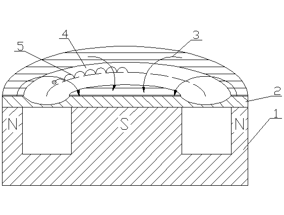 Рисунок 2.1 – Схема магнетронной распылительной системы с плоской мишенью: 1 – магнитная система; 2 – катод-мишень; 3 – силовая линия магнитного поля; 4 – зона наибольшей эрозии поверхности катода; 5 – траектория движения электрона