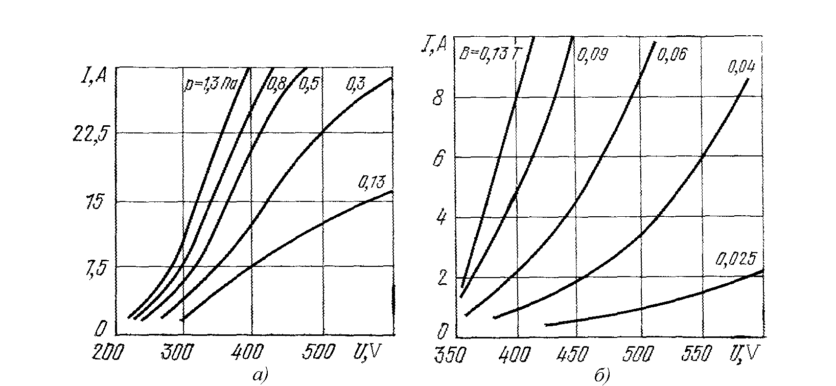 Рисунок 2.2 – Вольтамперные характеристики магнетронных систем распыления: а) с алюминиевой мишенью размером 4060 см при постоянном магнитном поле 0,03 Тл и различном давлении аргона; б) с алюминиевой мишенью диаметром 160 мм при постоянном давлении аргона 0,3 Па и различной индукции магнитного поля[3]