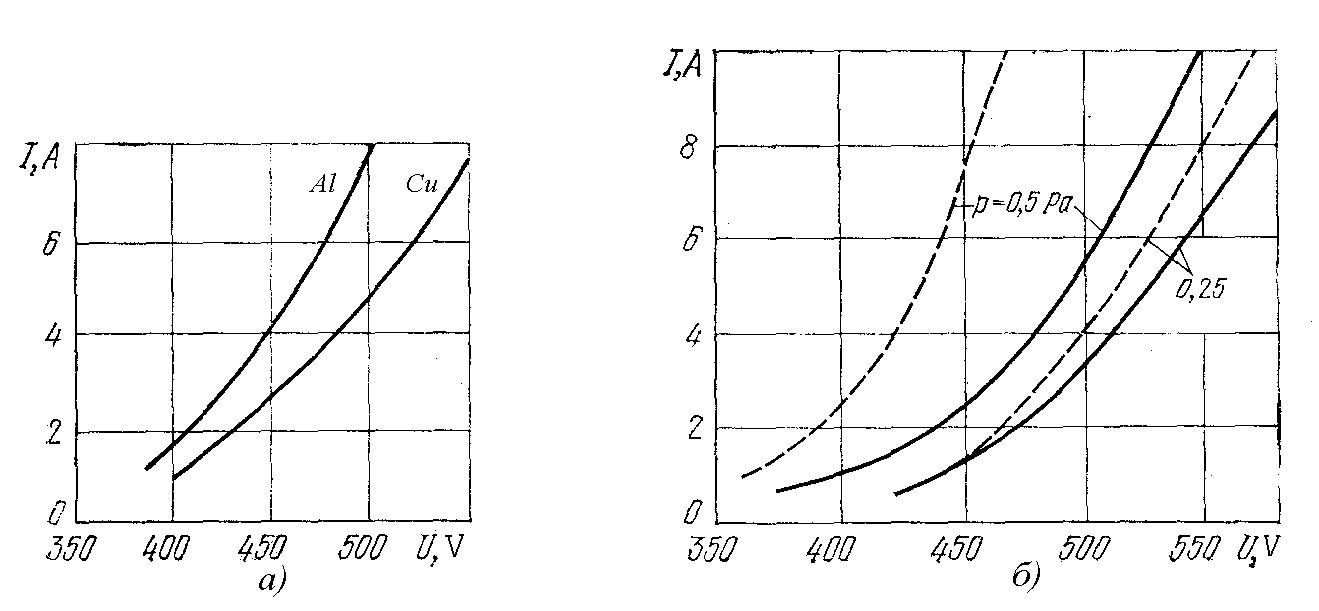 Рисунок 2.3 – Вольтамперные характеристики магнетронной системы распыления: а) с плоской мишенью из различных металлов при постоянном давлении 0,5 Па и индукции магнитного поля 0,08 Тл; б) с конической новой (сплошные линии) и эродированной (штриховые линии) мишенями при индукции магнитного поля 0,06 Тл и различном давлении
