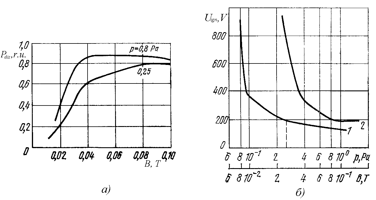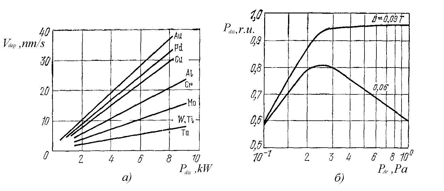 Важным параметром разряда, определяющим скорость распыления, является электрическая мощность, причем скорость осаждения пленки почти линейно зависит от приложенной мощности. (смотри рисунок 2.4а) [3]. В свою очередь мощность разряда при постоянной мощности источника зависит от p и В. В достаточно слабых магнитных полях существует такое значение p, при котором на разряде выделяется максимальная мощность (смотри рисунок 2.4б). С ростом В ( до 0.04 Тл) при низких значениях p мощность разряда сначала резко возрастает, затем замедляется и при В=0,080,1 Тл становится максимальной. При достаточно высоком p максимальная мощность достигается уже при В=0, 040,06 Тл (смотри рисунок 2.5а).