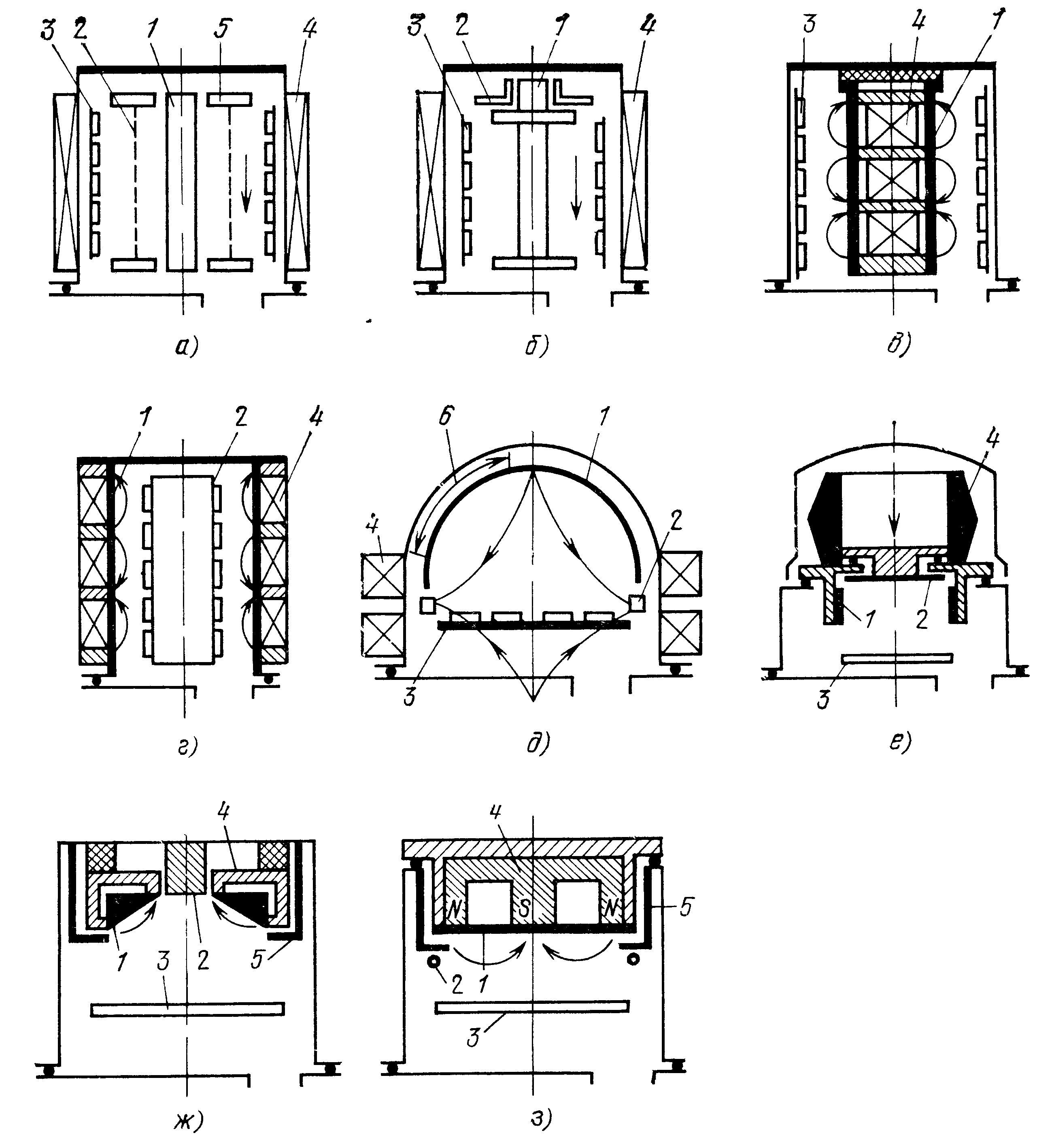 Рисунок 3.6 – Конструкции магнетронных распылительных систем с переменным магнитным полем