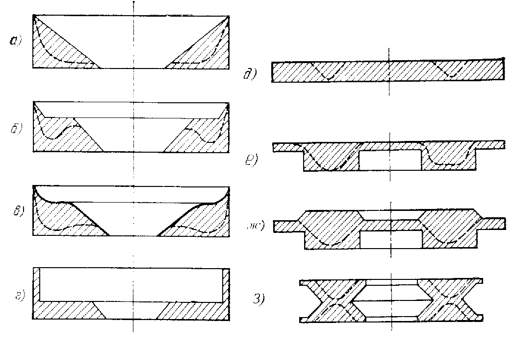 В последнее время эта проблема решена и для плоских мишеней, конструктивные варианты которых приведены на рисунках 3.3 д - з. В отличие от традиционной плоской формы (рисунок 3.3, д), мишень выполняется с утолщением в области зоны эрозии (рисунок 3.3, е) а в держателе делается канавка аналогичной формы. Такая мишень в процессе распыления обеспечивает хороший тепловой контакт за счет ее термического расширения. Помимо хорошего охлаждения при этом достигается и более высокий коэффициент использования распыляемого материала по сравнению с равнотолщинной мишенью. Еще выше этот эффект для мишеней, показанных на рисунках 3.3, ж и з (до 70% и 90% соответственно).