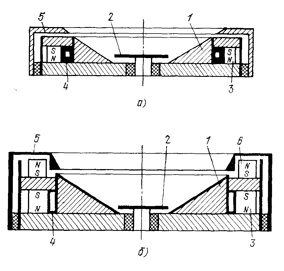 Рисунок 3.5 – Конструкции магнетронных распылительных систем с конической мишенью: 1 – мишень; 2 – анод; 3 – магнитная систенма; 4 – водоохлаждаемый держатель; 5 – экран; 6 – дополнительный магнит