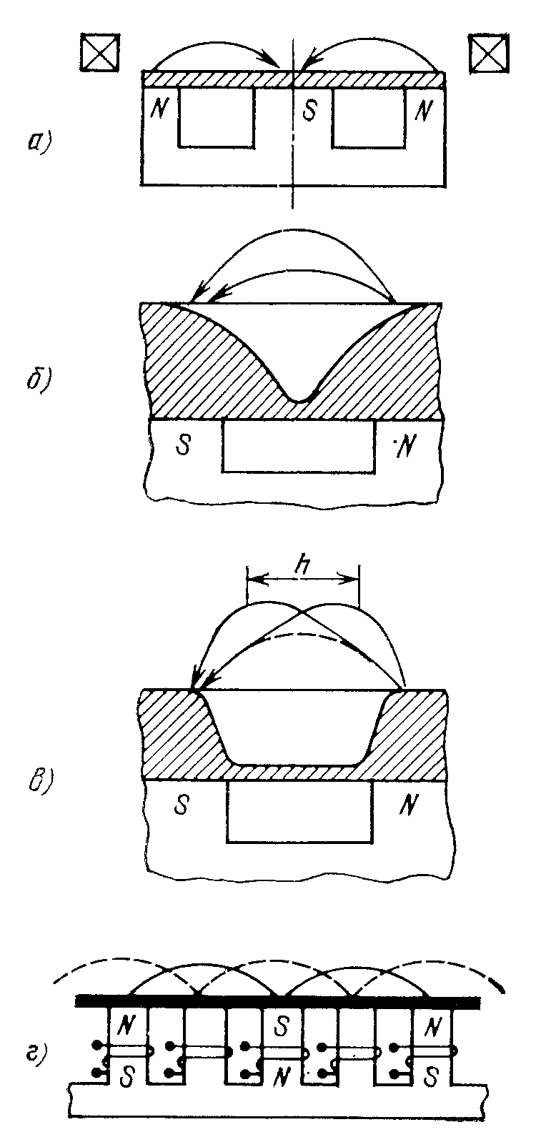 С коэффициентом использования распыляемого материала тесно связана проблема равномерности распыления мишени. Выше были показаны пути повышения коэффициента использования распыляемого материала выбором мишени определенной геометрии. Однако существует еще один путь — применение сканирующего магнитного поля. Существуют два способа перемещения магнитного поля по поверхности мишени: электромагнитный и механический. В первом случае вокруг мишени устанавливают электромагнит, который создает дополнительное переменное магнитное поле, перпендикулярное поверхности мишени (рисунок 3.6, а). При неподвижном постоянном поле арочной конфигурации профиль зоны распыления имеет вид, показанный на рисунке 3.6, б. Использование дополнительного переменного поля производит деформацию основного поля: вершина арки начинает смещаться от средней линии, в результате чего происходит симметричное смещение зоны максимальной эрозии, и профиль распыления становится почти прямоугольным (рисунок 3.6, в). Равномерность распыления мишени можно значительно увеличить, используя многоячеистую электромагнитную систему, питающуюся от сети переменного тока (рисунок 3.6, г).