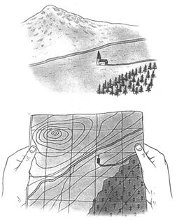 Рис. 1 Ориентирование карты по наземным объектам. Карту следует разворачивать до тех пор пока взаиморасположение объектов на местности и обозначений этих объектов на карте не совпадет (гора на карте окажется левее и дальше церкви) (по Уилсону Н., 2004)