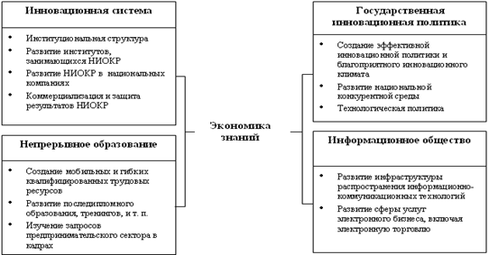 Экономика, основанная на знаниях, держится на четырех `опорах`: инновационная система, информационное общество, непрерывное образование, государственная инновационная политика (см. рис. 1)