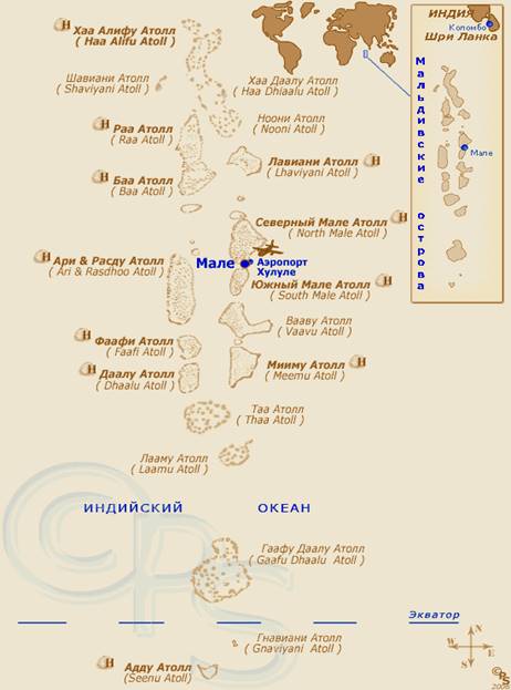 Географическое положение: Островное государство Мальдивы находится в 700 км. к юго-западу от Шри-Ланки, в экваториальных водах Индийского океана. Две практически параллельные цепи островов, окаймленных коралловыми рифами, и лежащих на ширине 80-120 км. друг от друга, тянутся на 860 км. с севера на юг.