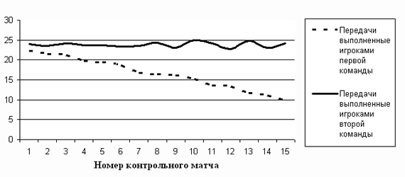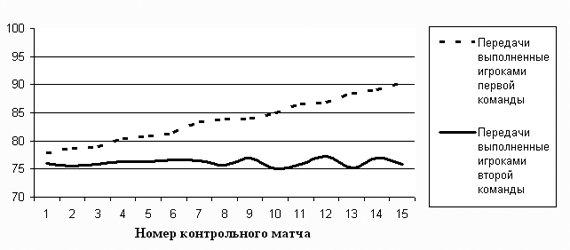 Таким образом, в течение пятнадцати контрольных матчей, игрокам первой команды удалось понизить количество выполненных передач верхом на 12,39%, а количество выполненных передач низом повысить на 12,61%. Во второй команде, на протяжении всех пятнадцати матчей, не удалось отметить какой-либо чёткой закономерности в увеличении или уменьшении передач выполненных низом по земле или верхом по воздуху.