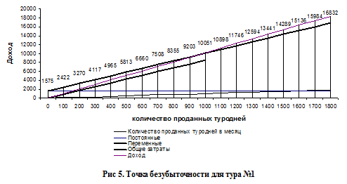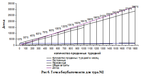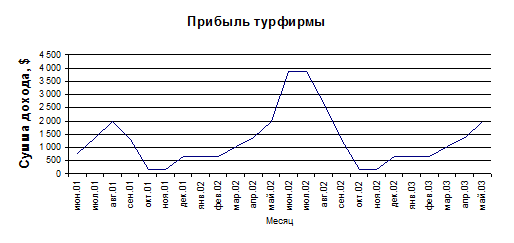 Как видно из рис. 6 в период с июня 2001 до апреля 2002 турфирма будет получать незначительную прибыль, т.к. объемы продаж в этот период предполагаются небольшие, но начиная с апреля пойдет постепенный рост и уже к июню размер прибыли достигнет пиковой точки $3877 и в дальнейшем будет колебаться в зависимости от сезона, при максимальном объеме продаж на уровне 560 туров в месяц.