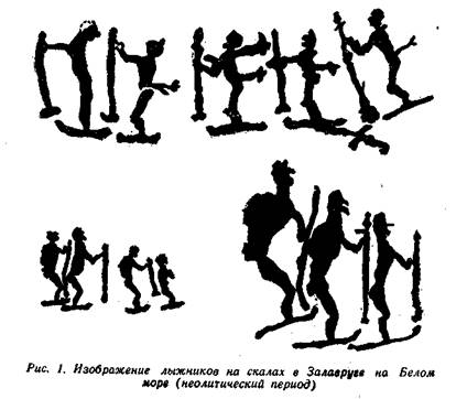 Сведения о появлении лыж на территории нашей страны получены советскими археологами при раскопках стоянок человека эпохи неолита (новокаменный век) на берегу Белого моря. Здесь на стенах пещер и на скалах были обнаружены изображения фигур животных и людей. Эти рисунки ученые относят к концу III — началу II тысячелетия до нашей эры. Они свидетельствуют о том, что в то время племена, населявшие северную территорию нашей страны, использовали лыжи. На скальных рисунках лыжи сравнительно узкие и длинные, с загнутыми носками. На рис. 1 изображены фигуры лыжников с одной палкой — это диктовалось условиями охоты, а длина и форма палки, сохранившаяся у народов Севера и до нашего времени, указывает на универсальность ее применения: один конец был заострен, другой утолщен. Такая палка могла служить и для передвижения на лыжах, и для защиты, и для устройства ночлега и т. д.