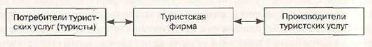 Туристская фирма— собирательное понятие. Под ней подразумевается предпринимательская структура, занимающаяся на коммерческой основе посредническими операциями в сфере купли-продажи туристских услуг. Сама туристская фирма не производит туристские услуги, она не располагает для этого необходимыми средствами производства, поэтому выполняет чисто посреднические функции, а именно по поручению потребители закупает разные туристские услуги у производителей (гостиниц, транспортных предприятий, предприятий питания и развлечения и др.). Туристская фирма занимает место посредника между производителем и потребителем туристских услуг (туристами), что показано на рис. 1.