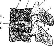 1 - тіло хребця; 2 - гіалінова пластинка; 3 - порожнина Лушки; 4 - фіброзне кільце; 5 - пульпозне ядро; 6 - передня повздовжня зв'язка; 7 - задня повздовжня зв'язка; 8 - поперечний виросток; 9 - остистий виросток