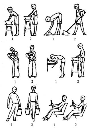 Враховуючи наведене та результати ергонометричних досліджень виконання найбільш поширених виробничих операцій і дій у повсякденному житті, визначено правильні і неправильні положення тіла, яких повинна набувати людина під час трудової діяльності і домашньої роботи (рис. 2.5-2.6).