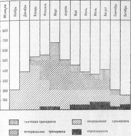 Аэробная производительность - способность человека обеспечивать свои энергетические расходы за счет кислорода, поглощаемого во время работы. Результат в беге на дальние дистанции в лыжных гонках во многом (60-80%) зависит от уровня аэробной производительности. И одна из главных задач подготовки спортсмена - увеличение этого уровня[6] . Многие тренеры и спортсмены сейчас увеличили объем работы, выполняемый интервальным методом. Чем это вызвано? Оптимальная форма тренировки на выносливость такая, когда координация движений и функциональная настройка всех систем организма происходят на фоне нарастающего утомления. Это очень важно с точки зрения психологической подготовки спортсмена к стрессовым ситуациям, возникающим во время соревнований. В то же время при использовании продолжительного непрерывного бега для бегунов на средние и длинные дистанции наблюдается все большая разница между тренировочной и соревновательной скоростями. Выросшие соревновательные скорости бега на длинные дистанции - следствие не только увеличения объема нагрузки, выполняемой непрерывным методом, но и повышения интенсивности бега. А последнее возможно при интервальной и повторной тренировках[7] . В возрасте 15-16 лет можно пробегать в неделю 60-80 км, в 20 лет и старше - от 100 до 160 км. После 2 месяцев такой тренировки рекомендуем для разнообразия программы постепенно вводить переменные и интервальные тренировки.