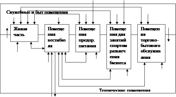 Первоначально здание гостиницы строилось в виде массива, отдельно располагаемого или сопряженного с окружающими общественными и жилыми зданиями. Длительный поиск наилучших планировочных решений привел к созданию пространственной композиции, специально предназначенной для деятельности, выполняемых в гостиницах. Помещения для ночевки туристов обосабливаются от помещений, связанных с оказанием иных услуг туристам. Соответствующие помещения распределяются в различные функциональные (архитектурные) блоки.