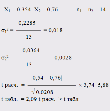 Гипотеза (`Х1 = `Х2 ) отклоняется с вероятностью q= 1 - s = 1 - 0,05 = 0,95.