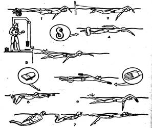 1. Проплыть 10-12 раз при помощи рук кролем на спине с ускорением, задержкой дыхания.