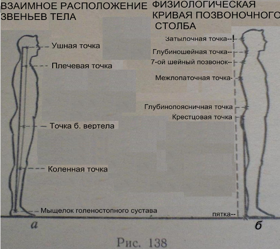 Другой характерный признак осанки — профиль позвоночника (величины изгибов в шейной, грудной и поясничной области). Специальным устройством измеряются расстояния от вертикали до верхних точек изгиба позвоночника и до точки затылка, которые изображены на рис. 138,6.