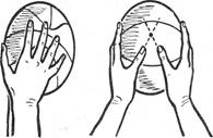 Большое значение в технике выполнения различных приемов игры с мячом имеет держание мяча (рис. 1). При бросках двумя руками не следует касаться мяча всей площадью ладоней, мяч нужно удерживать кончиками пальцев (рис. 2), что позволит лучше управлять мячом и добиваться большей точности попадания.