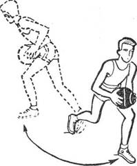 Финты с имитацией перехода на ведение . Нападающий делает выпад вперед- в сторону, будто собирается в этом направлении обвести защитника. Как только последний перенесет тяжесть тела в этом направлении, нападающий резко отталкивается выставленной вперед ногой и, изменив направление, переходит на ведение с другой стороны защитника. После первого ложного движения можно передать мяч или бросить в корзину.